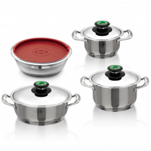The Mega Combo is ideal for the bigger family where you have teen to adult children or where extended families live together. With this set of cookware you can prepare any meal, from cooked breakfasts to spaghetti bolgonaise, pot- roasted chicken with vegetables or a sweet dessert. With stainless steel handles you can now finish off your meal in the oven.